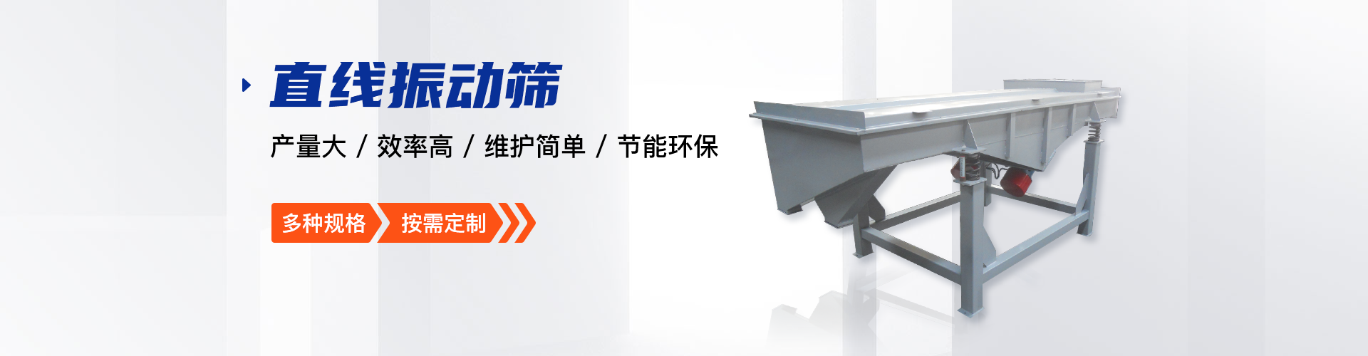 公司的主要產品有:三次元旋振篩、直線振動篩、圓形搖擺篩、方形搖擺篩、脫水篩、超聲波振動篩、塑料振動篩、直排篩、高頻篩、450過濾篩、實驗篩、斗式提升機、皮帶輸送機、過濾器、振動電機等,